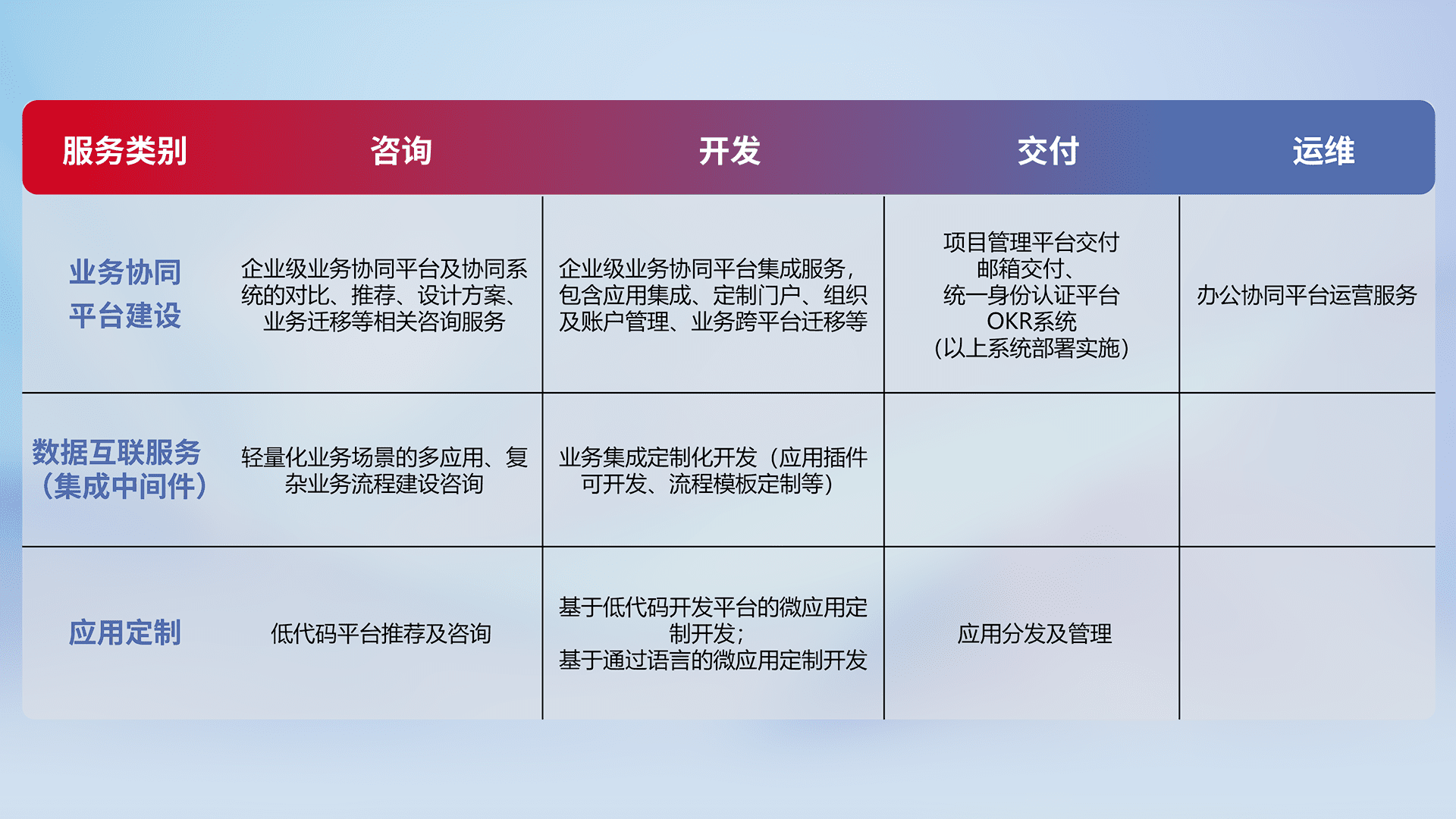 针对钉钉、、、、企微、、、、IDaas等平台级产品提供产品的规划、、方案、、交付、、定制化开发等服务,,,,实现如统一协同办公、、智能客户服务、、混合会议管理、、智能数据查询、、、、等业务场景,,,,实现数字化转型。。。