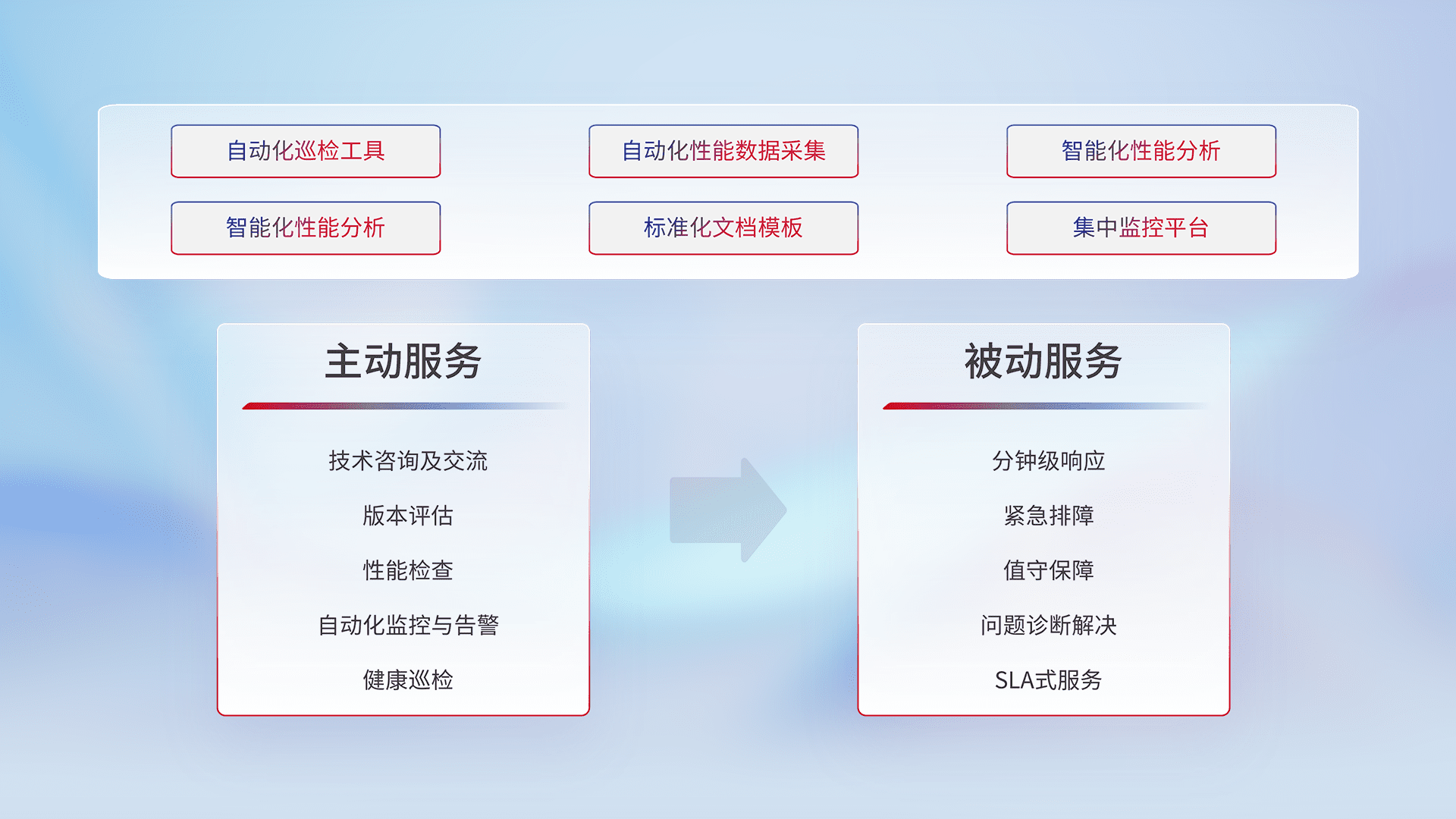 智能化工具和标准化文档,,,,保障服务质量,,,,提供主动服务(包含技术咨询、、、版本评估、、、、性能检查、、、、自动化监控与告警、、健康巡检)和被动服务包含(分钟级响应、、、紧急排障、、、、值守保障、、、、问题诊断解决、、SLA服务)。。